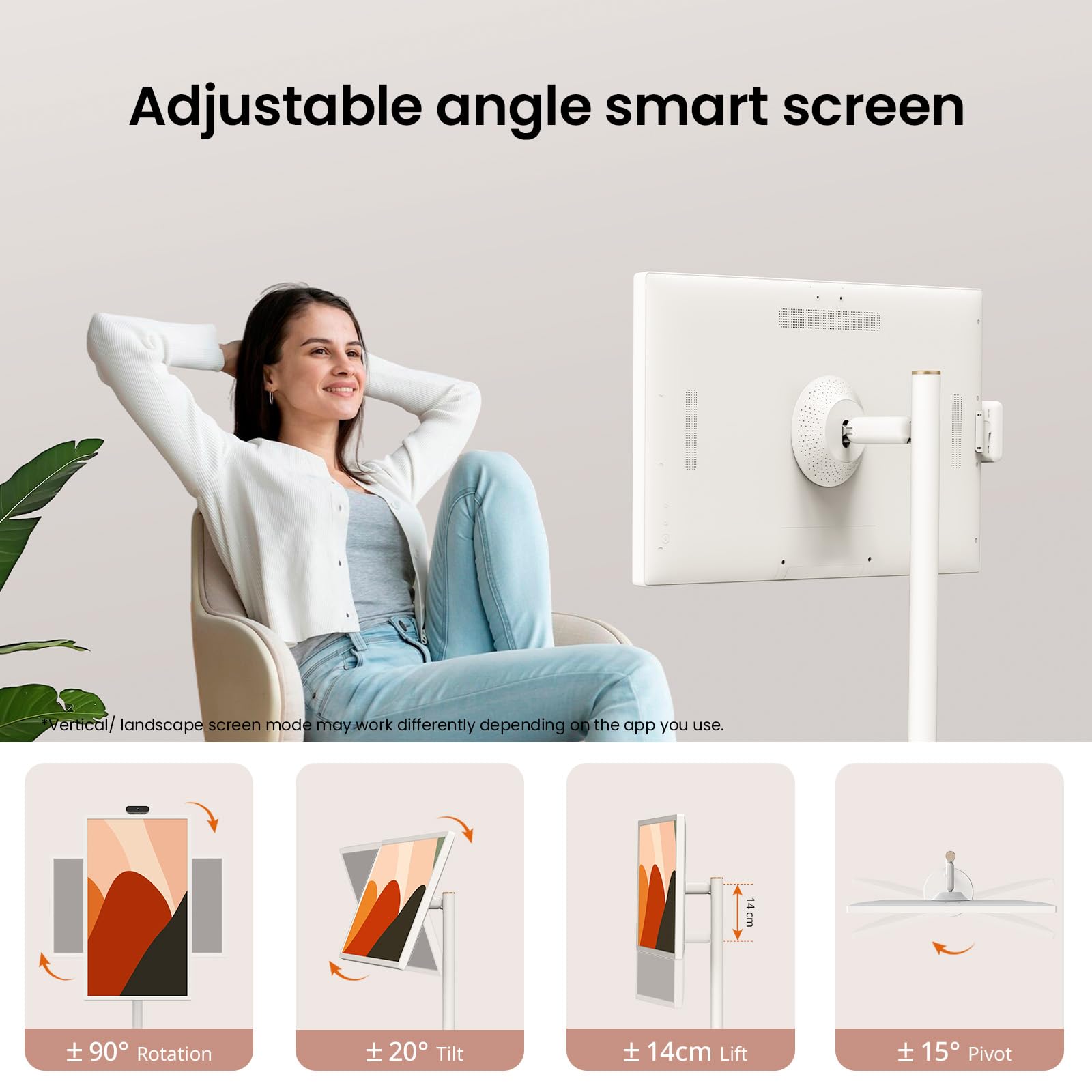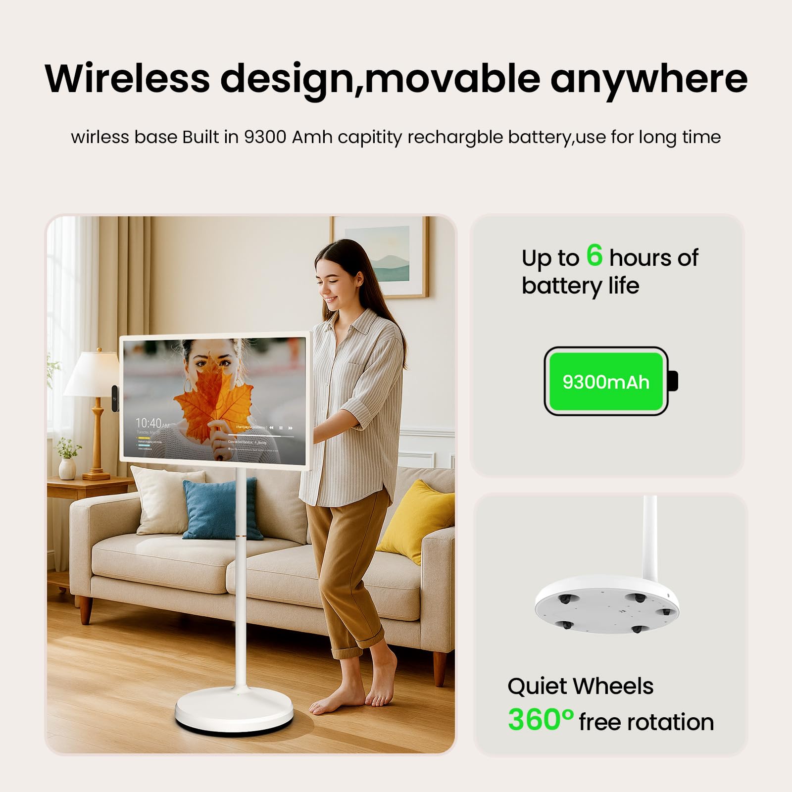 【Foldable Dual-Section Pole & Omnidirectional Mobile Base】Innovative foldable pole design for compact storage and portability. Paired with 5 silent omnidirectional wheels for effortless mobility indoors/outdoors. Screen adjusts in height, rotation, and tilt for optimal viewing angles during cooking, yoga, gatherings, or movie nights.